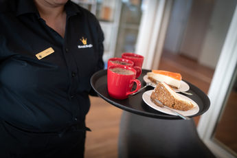 I vår lune kafé serverer vi smakfull lunsjmat og deilige, hjemmebakte kaker.
